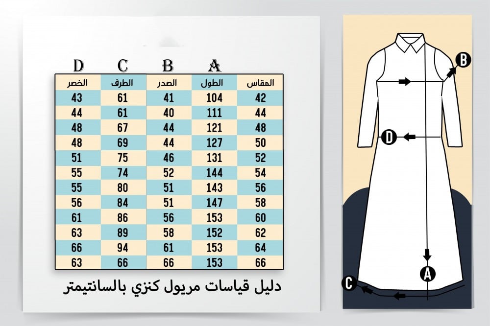 - يتوفر المريول بمقاسات تبدا من مقاس 40 وحتى مقاس 66 لضمان تلبية احتياجات جميع الاعمار.