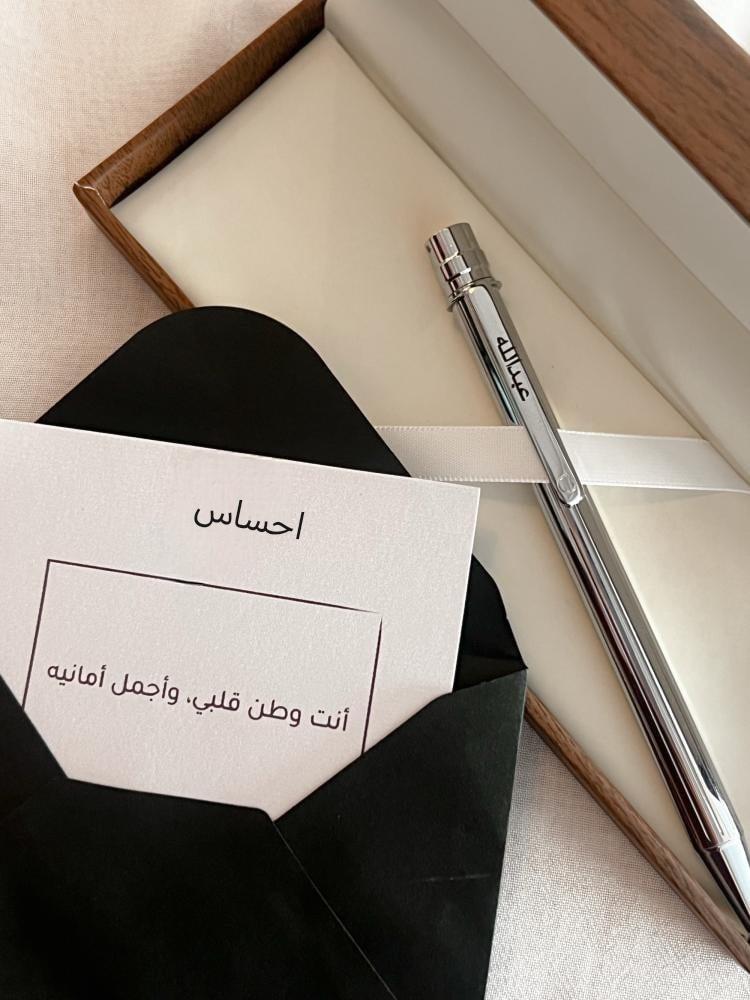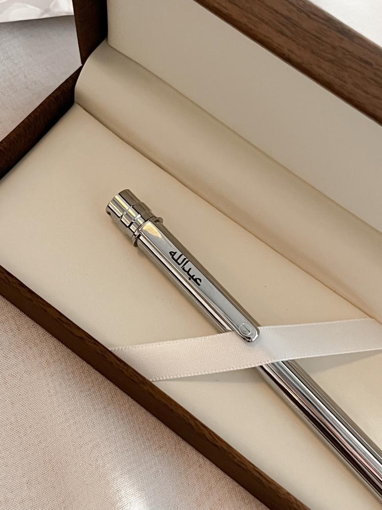 تميّز بأسلوبك الخاص مع قلم راقٍ يحمل اسمك بحفر دقيق ولمسات فاخرة. هذا القلم الأنيق ليس مجرد أداة للكتابة، بل قطعة تعكس شخصيتك وتضيف لمسة من التميز إلى مكتبك أو هداياك الخاصة.